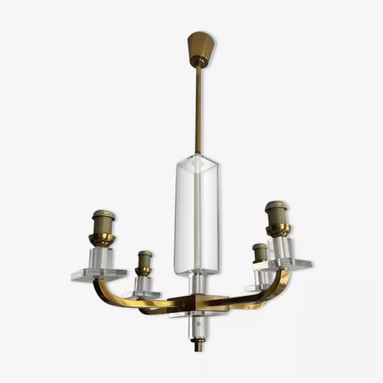 Lustre moderniste datant des années 70 en laiton massif et en plexiglass trempé dans le gout du travail de jacques adnet et plus généralement du courant moderniste (1930)opter pour des ampoules doré demi calotte pour rester dans les mêmes tons ou les abats jours de votre gout (il y a les bagues pour serrer les abats jours). Cache fils en laiton. Ampoule e14. Electricité vérifiée.
