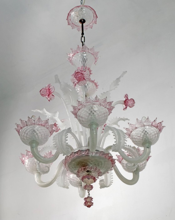 Un élégant lustre à six lumières en verre de Murano couleur lait et finitions roses sophistiquées. Avec une colonne bulbeuse centrée qui émet des branches et des fleurs et découpe finement les feuilles en verre de Murano.