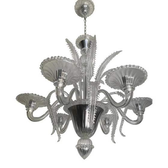 Lustre vénitien en verre de Murano transparent, orné de feuilles de fougères « Felci ».