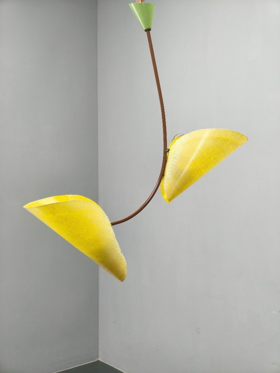 Ce plafonnier sculptural présente une structure en métal laqué aux bras aux courbes organiques et des abat-jour en fibre de verre jaune vif, signature de la marque. Les diffuseurs légers créent une lumière douce et tamisée tout en affirmant une forte présence visuelle.