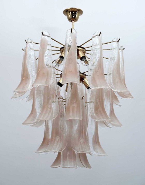 Lustre de Murano produit par Mazzega, composé de 30 pétales en verre rose et transparent, soutenus par une structure en laiton doré.
