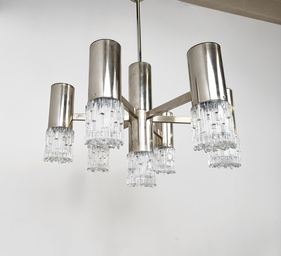 Lustre du milieu du siècle en métal chromé avec des abat-jours en verre faits à la main.