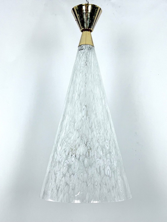Lustre très rare en verre de Murano et laiton, conçu par Angelo Brotto pour Esperia et fabriqué en Italie à la fin des années 70. En excellent état vintage, avec des traces d'usure normales. Verre épais sans ébréchure ni fissure. Il est équipé de trois douilles pour ampoules E27. Entièrement fonctionnel selon les normes européennes, adaptable sur demande aux normes américaines.