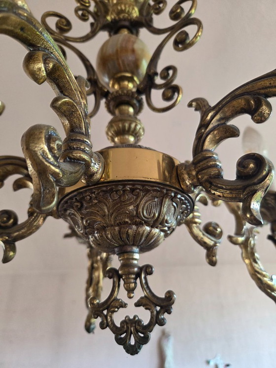 Ce magnifique lustre antique attire tous les regards dans n'importe quel intérieur. Avec ses élégants détails en marbre et sa finition en laiton, ce lustre dégage un charme intemporel. Parfait pour les amateurs de style vintage. Le lustre est en bon état, avec seulement une légère décoloration qui ajoute à son aspect authentique.