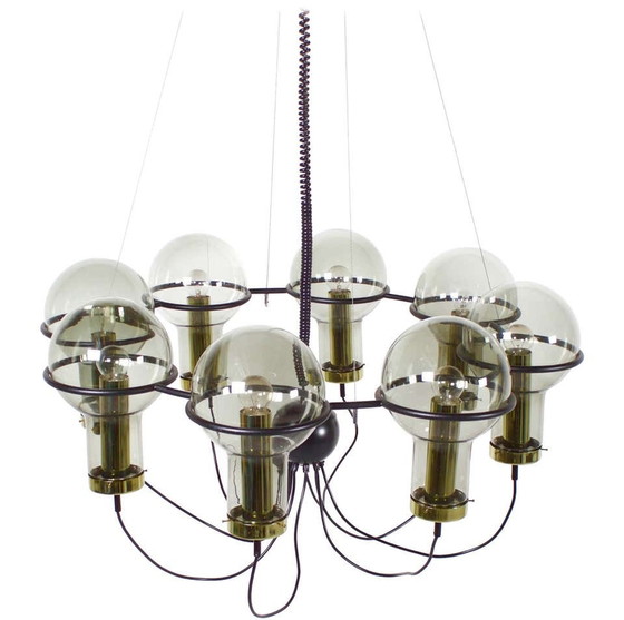 Huit "Maxi Globes" soufflés à la main de 23 cm de diamètre. Anneau : métal noir, 116 cm de diamètre. Quincaillerie : laiton. Câblage : Noir, en très bon état. Ces lustres sont suspendus à quatre minces fils métalliques et peuvent être réglés en hauteur. Les globes reposent sur un grand anneau en métal noir d'un diamètre de 116 cm. Mots-clés : Stilnovo, Sarfatti, Arteluce, Limburg Glashutte