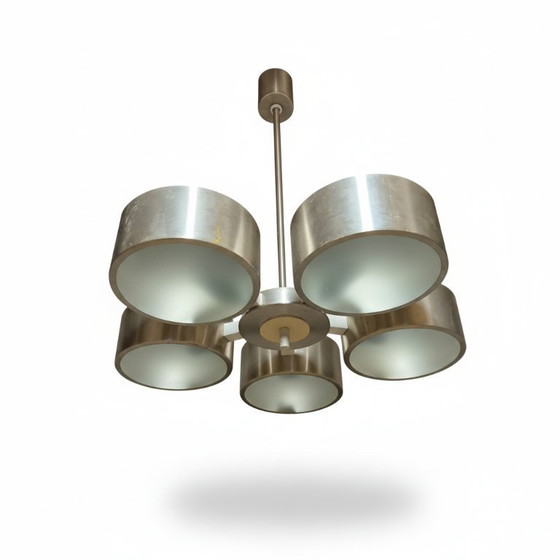 Ce lustre vintage allemand des années 1970 présente une silhouette futuriste saisissante, composée de cylindres en aluminium poli et de diffuseurs en verre dépoli. Sa forme géométrique et sa construction épurée reflètent la fascination de l'époque pour le design futuriste et les matériaux haut de gamme.