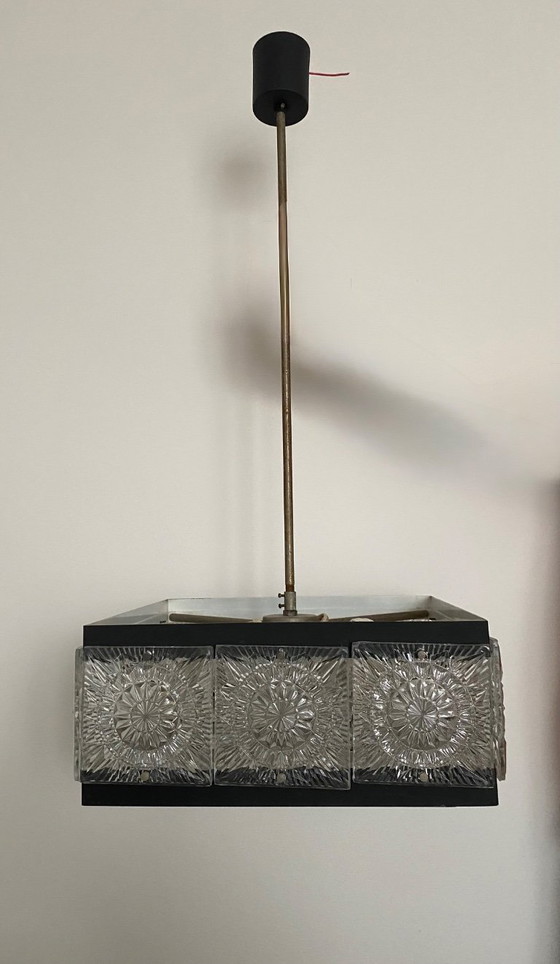 Ce luminaire est composé de panneaux de verre carrés assemblés pour former un carré de verre. Design et lumière magnifiques. Chaque panneau est en verre de Bohême gravé, ce qui amplifie la lumière. Très bon état, notamment du verre. La structure métallique présente des traces d'usure.