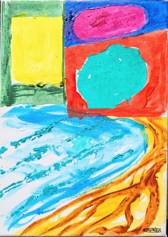 Cette œuvre est une peinture acrylique ORIGINALE. Elle s'inspire des couleurs et des formes du paysage marin de la ville de Lyme Regis. Ces formes ont été représentées à l'aide de peintures acryliques vives.