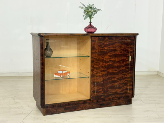 Ce magnifique meuble bar Art Déco est à vendre. Il se distingue par son allure exclusive et sa qualité de fabrication irréprochable. Réalisé en luxueux placage de loupe de bouleau (également appelé bouleau nuageux), son veinage profond et vibrant attire tous les regards. Son design élégant est sublimé par de délicates incrustations dorées sur les panneaux de bois et de verre, ainsi que par une poignée en laiton massif.
