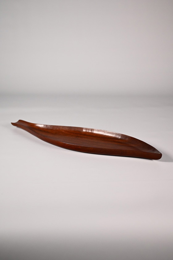 Magnifique plat de service en acajou. Sa forme évoque un poisson. Il a conservé toute sa beauté malgré les années.