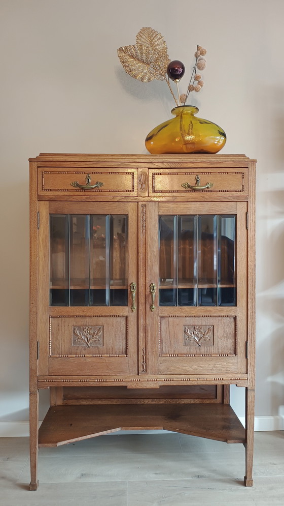 Cette vitrine murale Art déco, fabriquée aux Pays-Bas, dégage une atmosphère chaleureuse et nostalgique grâce à ses éléments classiques. Elle est ornée de fenêtres à facettes en vitrail. Le bois est magnifiquement fini, avec des bords décoratifs et des sculptures détaillées. De plus, d'élégantes ferrures en laiton ornent les deux tiroirs et les portes à charnières. En bref, ce superbe meuble possède un design unique et une identité bien affirmée.