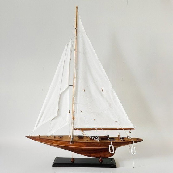 Cette maquette offre un aperçu détaillé de l'Endeavour. Fabriquée artisanalement à partir de planches de bois individuelles, elle est basée sur des plans, des dessins et des images du véritable yacht Endeavour.