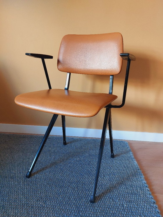 Structure métallique noire, assise et dossier recouverts de cuir Skai cognac. La chaise a été fabriquée dans les années 1960 d'après un dessin de Ynske Kooistra.