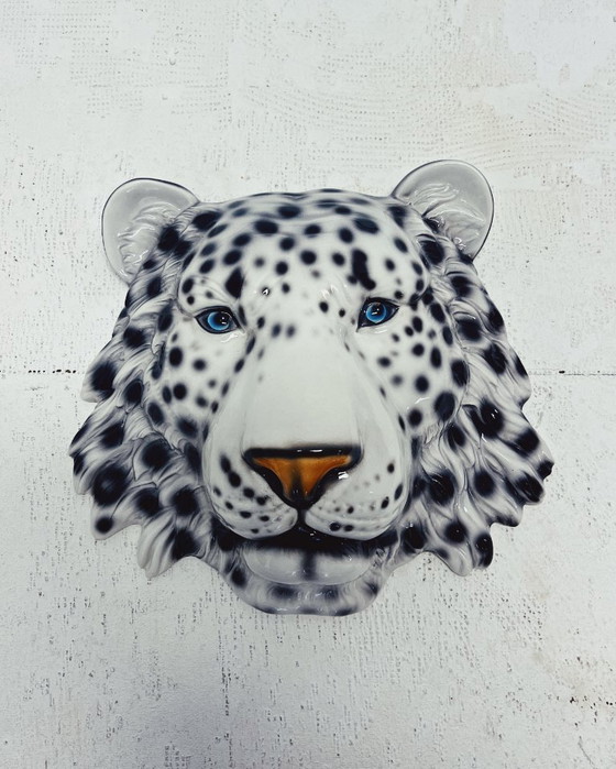 Plaque murale/masque unique, entièrement réalisé à la main, représentant une panthère blanche. Cette statue de style Hollywood Regency, en céramique peinte à la main et fabriquée en Italie, apportera une touche d'élégance et de caractère à votre intérieur !