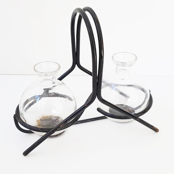 Etat correct. Torsion et oxydation du métal. Bon état du verre mais à nettoyer. Les bouchons ne sont pas fournis. Référence : Mathieu Matégot, Jousse Entreprise, 2003, page 230, n°180.
