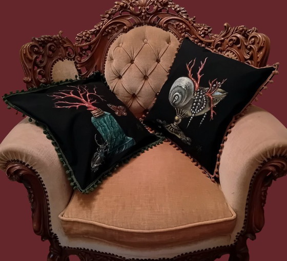 Mes coussins font partie de la collection CORAUX ET COQUILLAGES. Ils sont en coton peint à la main, à fermeture velcro et lavables. Leur format standard est de 45 x 45 cm et ils se ferment par un velcro. Le style des peintures s'inspire des enseignes publicitaires vintage.