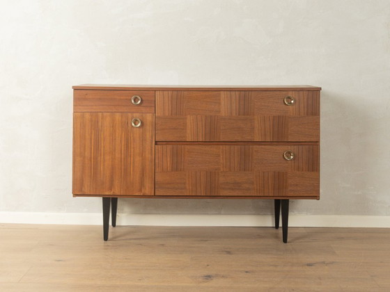 Meuble à chaussures classique des années 1960. Structure en placage noyer, deux portes battantes, un tiroir, une porte, trois étagères et pieds fuselés noirs.