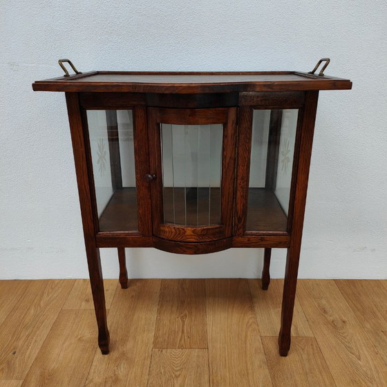 Apportez l'atmosphère des années 20 dans votre intérieur avec ce magnifique meuble à thé en bois ! Fabriqué en chêne chaleureux, ce superbe meuble allie élégance et fonctionnalité. Son atout principal ? Le plateau amovible orné de poignées en laiton, qui permet de servir directement les boissons à vos invités. Derrière la vitrine en verre bombé, votre plus beau service à thé reste à l'abri de la poussière. Admirez également les délicates étoiles gravées sur les panneaux latéraux. Ses pieds fins et fuselés lui confèrent une allure majestueuse. Les légères marques d'usure sur le bois lui donnent un authentique charme vintage. Utilisez-le comme un élégant buffet dans votre salon ou comme une table d'appoint. Un meuble intemporel pour les véritables passionnés !