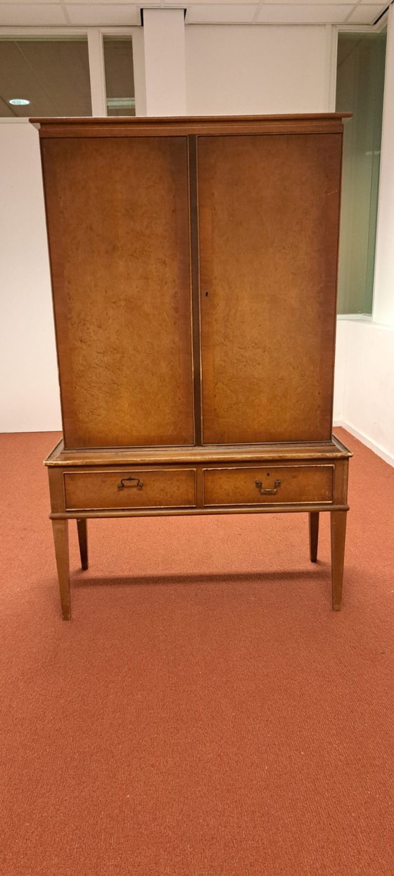 Élégant meuble ancien/rétro en noyer, probablement des années 1940-1950. Ce meuble présente un design élégant et élancé, avec des pieds fuselés, des charnières en laiton et deux tiroirs spacieux dans la partie inférieure. Une pièce de caractère aux proportions harmonieuses et à la chaleureuse teinte du bois.