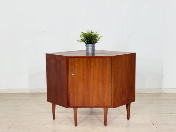 À vendre : un élégant meuble d'angle des années 1960. Sa forme unique le rend idéal pour les angles de pièces, offrant un espace de rangement pratique dans un format compact.