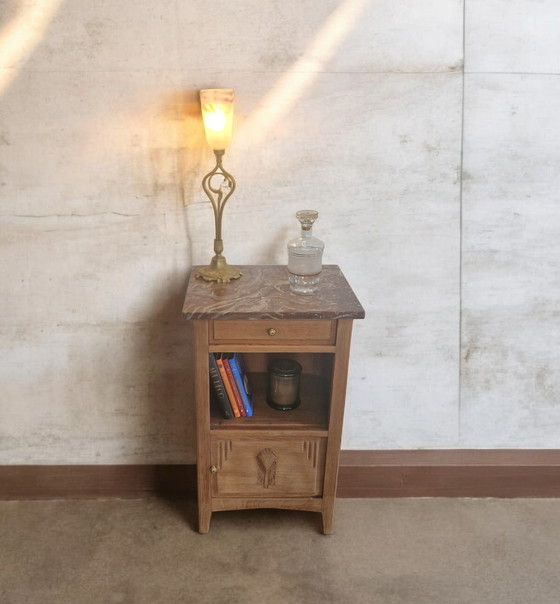 Élégante table de chevet Art déco datant des années 1920–1930, réalisée en chêne massif et surmontée de son plateau en marbre veiné d’origine.