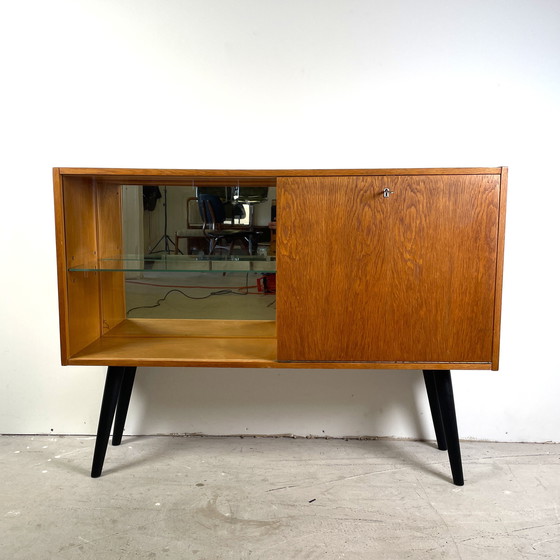 Subtil meuble de télévision sur pieds angulaires noirs mesurant 30 centimètres de hauteur. Il est réalisé en placage de chêne avec une finition brillante comme de la soie. A gauche, la partie meuble avec un miroir légèrement patiné dans la paroi arrière. À droite, l'abattant s'ouvre à l'aide d'une clé et laisse apparaître le bar.