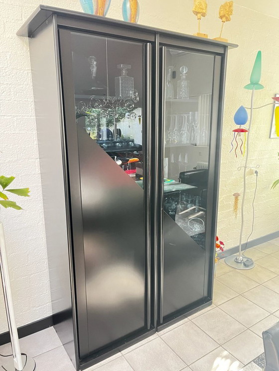 À vendre : vitrine haute. Prix d'origine chez René Pans : 4 000 florins. Finition noir satiné. En excellent état. Légères traces d'usure sur les barres d'ouverture. Bonne affaire. À monter soi-même. Meuble lourd. Dimensions approximatives : 200 x 100 x 50 cm.