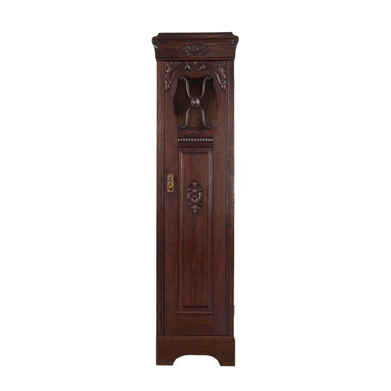Sa structure est recouverte d'un placage en chêne. La surface a été rénovée. À l'intérieur, quatre étagères fixes offrent un espace pratique. Le meuble s'ouvre grâce à un système de porte classique, permettant un accès aisé à son intérieur. La clé est fournie.