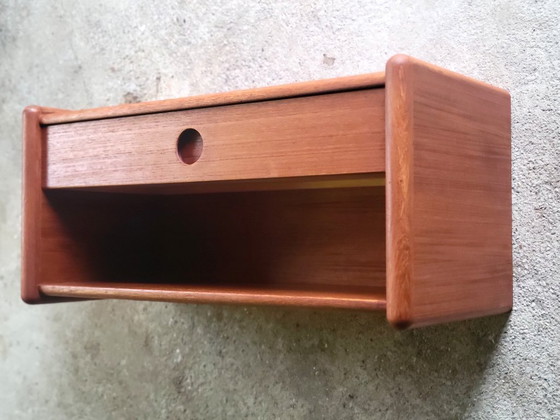 Ce magnifique meuble mural suspendu a été conçu par Kai Kristiansen et fabriqué par Vildbjerg au Danemark en 1960. Réalisé en teck de haute qualité, il offre un aspect chaleureux et naturel. Le tiroir, avec sa poignée intégrée, lui confère une élégance certaine. Sa finition impeccable permet de l'admirer sous tous les angles. Kai Kristiansen est reconnu pour ses créations raffinées qui allient harmonieusement fonctionnalité et esthétique. Ses modèles, caractérisés par des lignes épurées et un style minimaliste, s'intègrent avec aisance dans les intérieurs classiques et modernes. Le meuble est en bon état, avec quelques traces d'usure sur sa face inférieure (les pieds étaient autrefois installés).