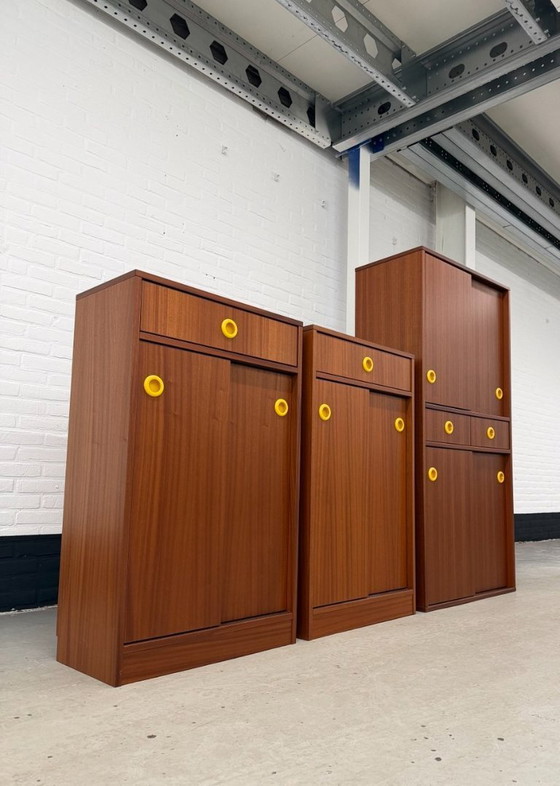 Meuble mural rétro unique en teck avec poignées jaune vif. Ce meuble a été fabriqué dans les années 1980 par un fabricant allemand. Il se compose de trois éléments robustes et de haute qualité. Les tiroirs sont équipés d'un système de fermeture amortie. Les portes coulissantes fonctionnent en douceur. Toutes les étagères sont réglables en hauteur. Ce meuble mural est modulable et peut donc être disposé comme un système mural unique ou comme trois éléments indépendants. Ce meuble est en bon état, avec des traces d'usage normales (voir photos). Il s'agit d'un article d'occasion qui peut être examiné avant la vente.