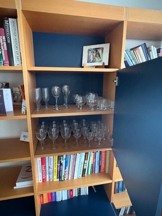 Meuble mural/meuble TV/bibliothèque Pastoe. Modèle L30510, avec porte d'armoire supplémentaire. Coloris : hêtre 50 et lavande texturée 40. Longueur totale : 3,35 m. Quatre étagères coulissantes en partie basse, profondeur : 54 cm.