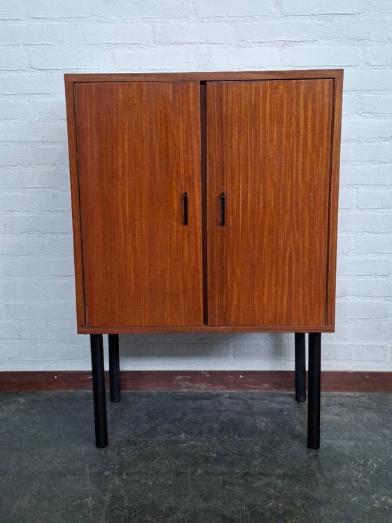 Un meuble vintage Simpla Lux à deux portes des années 1960, en teck avec pieds en métal noir et poignées d'origine. Ce meuble présente des traces d'usage normales pour son âge (voir photos).