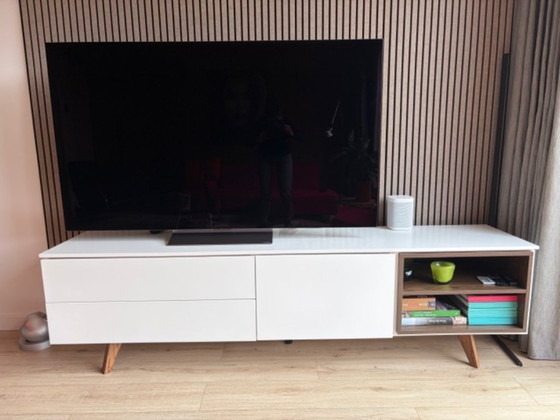 Meuble TV moderne « Plain » de Trendhopper, coloris blanc et noyer. Il comprend deux tiroirs, un placard avec passe-câbles et deux compartiments ouverts.