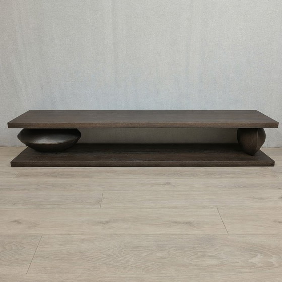 Ce meuble TV allie fonctionnalité et design sculptural. Ses pieds arrondis aux formes organiques, situés de part et d'autre, assurent une stabilité optimale au plateau et à la base. Son design unique le rend idéal non seulement comme meuble TV, mais aussi comme table d'appoint, par exemple derrière un canapé.