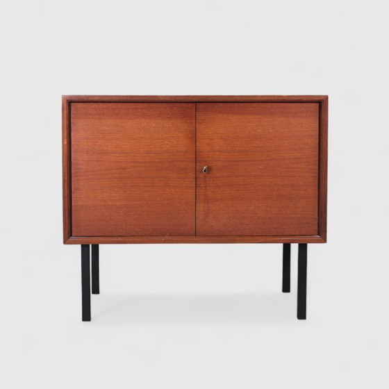 Armoire vintage en placage de teck avec un beau design en bois des années 1960, par la marque Nölgen. Fabriqué en Allemagne. L'étagère est amovible. Les portes se ferment avec une clé.
