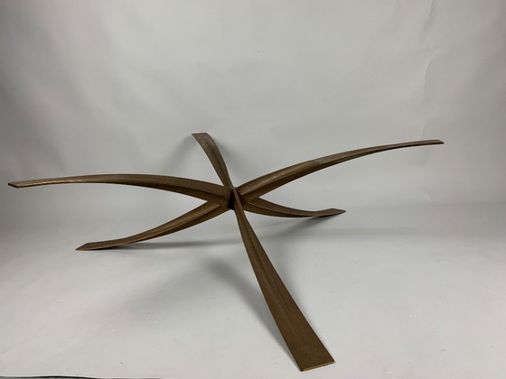 Cette table basse moderne a été conçue par Michel Mangematin. Elle se caractérise par une base en métal unique et sculpturale avec une finition brune, mettant en valeur une esthétique contemporaine. Le design de la table est à la fois fonctionnel et artistique, ce qui en fait une pièce remarquable dans n'importe quel espace de vie.