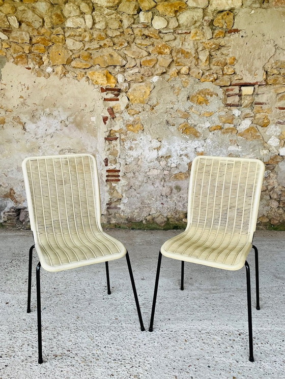 Mid-century, vintage , industriel patio, jardin , extérieur chaises Fantasia, ensemble de 2, circa 1950s. Les sièges des chaises sont en plastique thermoformé avec un motif tissé de couleur ivoire. Les pieds et la structure sont en acier tubulaire. Les sièges ont une assise ergonomique avec un avant en cascade et un arrière ergonomique pour fournir soutien et confort. Les chaises sont dans un bon état général d'origine et vintage avec quelques marques et signes d'utilisation antérieure sur les sièges, les dossiers et les bords des structures en plastique ainsi que la patine de l'âge et du temps et les couleurs légèrement délavées (voir photos). Il n'y a pas de fissures sur le plastique. Une ancienne marque d'usage sur le côté supérieur droit du dossier d'une des chaises (voir photo). Note : Une des chaises a une hauteur au dossier de 83 cm et l'autre de 84 cm. La finition des pieds a été restaurée avec un acrylique noir brillant pour l'intérieur et l'extérieur (voir photos). Les embouts des pieds en plastique noir ont été remplacés et sont neufs ( Voir photos). Les marques du fabricant sont embossées au dos des chaises ( voir pho) sous Ref 2015. Toutes les photos ont été prises à la lumière naturelle extérieure, certaines couleurs peuvent varier en fonction de la luminosité, des angles, des reflets de la lumière et de la perspective dans laquelle elles sont vues.