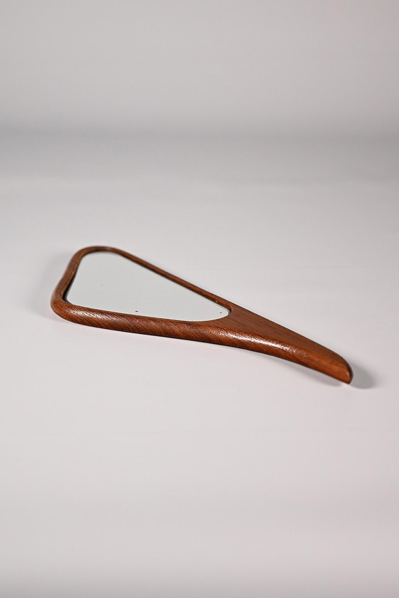 Miroir à main danois en bois de teck. Pièce très élégante aux formes typiques du design du milieu du XXe siècle. Le miroir présente quelques petits éclats, mais reste en bon état vintage.