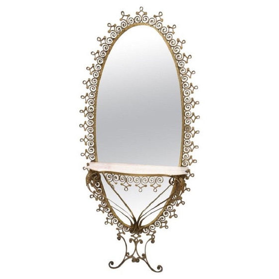 Nous sommes heureux de vous présenter ce superbe miroir ovale au sol, une pièce exquise du design italien du milieu du siècle dernier, dans le style du talentueux designer Pier Luigi Colli. Ce miroir majestueux présente un cadre en fer forgé magnifiquement doré, mettant en valeur un captivant décor ondulé orné de boucles et de spirales qui se succèdent élégamment à travers un motif harmonieux, entrecoupé de délicats motifs floraux. La dorure met en valeur le design complexe, créant un équilibre parfait entre opulence et élégance discrète. Ce miroir n'est pas seulement une pièce maîtresse mais aussi une table console fonctionnelle, dotée d'un plateau en marbre clair raffiné avec des veines roses douces. Cette double fonctionnalité lui permet de servir à la fois de table d'appoint pratique et de grand miroir, offrant un endroit idéal pour les retouches de dernière minute ou pour exposer des objets décoratifs. Grâce à ses caractéristiques uniques, ce miroir est idéal pour mettre en valeur n'importe quelle pièce de votre maison, qu'il s'agisse d'une entrée, d'un salon ou de n'importe quel espace qui pourrait bénéficier d'un meuble distinctif. Il se transforme sans effort en un point focal d'admiration, invitant les invités à apprécier sa beauté et son savoir-faire. Posséder ce miroir, c'est ramener chez soi un exemple fantastique et rare du design italien du Mid Century, ce qui en fait un ajout précieux à toute collection ou décor. Ne manquez pas l'occasion de rehausser votre espace avec cette remarquable pièce d'art.