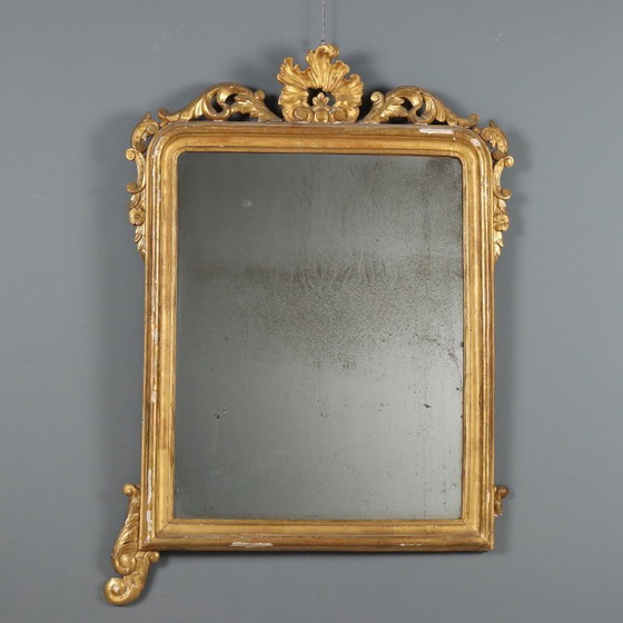 Miroir en bois sculpté et doré. Le cadre mouluré est orné de sculptures de feuilles, de fleurs et de volutes sur la corniche et les supports de la base, dont l'un est manquant. Italie, fin du XVIIIe siècle.