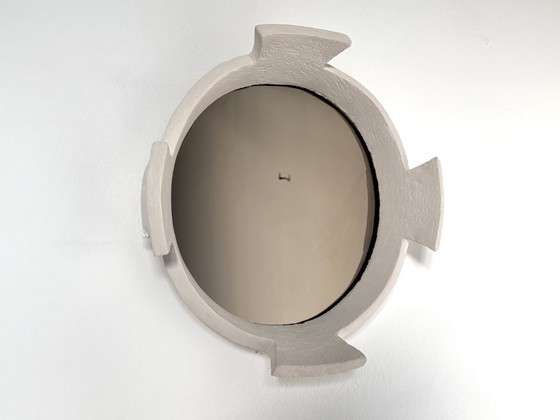 French contemporary ceramic mirror by Renzo Maar. Dimensions: 27 (D in centimeters). Material: ceramic (white stoneware enameled), glass; signed. Inspired by antiquity patterns like Greek meanders, this mirror made in a white pure stoneware evokes a four-leaf clover. This unique piece is available immediately but custom orders are possible (please note that each piece is handmade in France and unique, dimensions and finishes may vary).