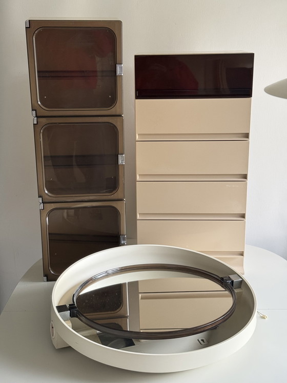 Une opportunité de posséder des objets décoratifs iconiques d'Alibert. L'ensemble comprend un ensemble vintage de tiroirs en plastique Alibert avec des reflets de plastique transparent marron (quelques fissures autour de la partie supérieure à l'arrière, mais cela ne gêne pas l'utilisation - voir les photos). Il y a 3 petites armoires suspendues avec le même plastique brun transparent (1 a une petite fissure mais sinon en bon état). Le miroir emblématique et recherché est également inclus. Ce miroir est en très bon état, l'éclairage est intact et fonctionne, le miroir met en valeur le même plastique brun transparent. Le trio d'objets peut être réutilisé pour de multiples intérieurs.