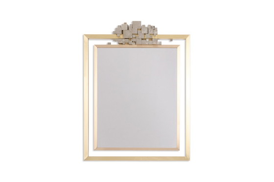 Miroir modèle « Boizot », en laiton, finition vernis satin et en pyrite en partie haute, à décor graphique.