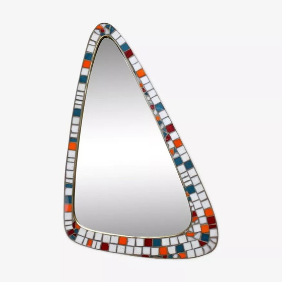 Miroir vintage de forme asymétrique au design rétro élégant, fabriqué à la main en Hollande. Le cadre est orné d'une mosaïque vibrante composée de carreaux multicolores, serti, des deux côtés d’un délicat pourtour en laiton doré, ajoutant une finition raffinée et chaleureuse. Idéal pour sublimer une décoration intérieure, ce miroir allie fonctionnalité et esthétique.
