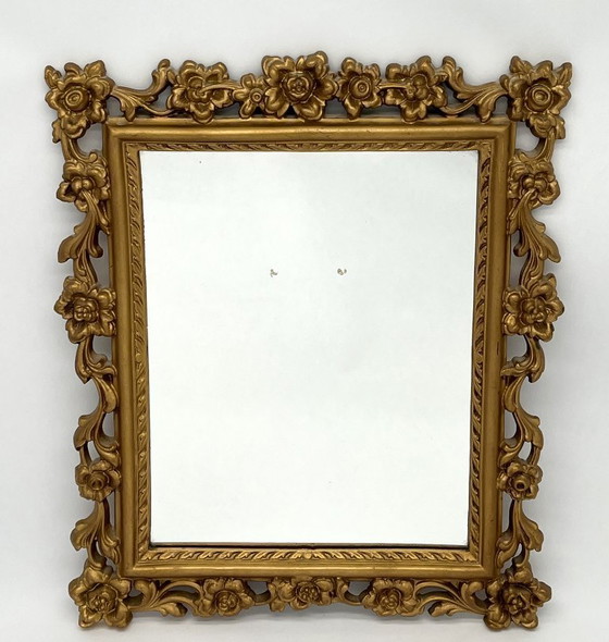 Miroir mural vintage italien décoratif de Cimena (Turin), avec un cadre baroque/rococo richement orné de motifs floraux et une finition dorée. Idéal pour un intérieur de style Hollywood Regency, un intérieur classique et élégant, ou pour apporter une touche de contraste stylée à un espace moderne.