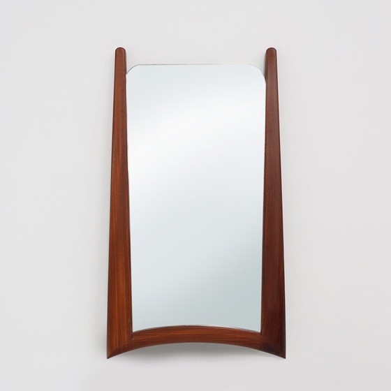 Miroir scandinave en teck massif au design minimaliste. Conçu dans les années 1960. Le cadre a un fond elliptique, ce qui crée une silhouette raffinée et organique. La plaque du miroir semble flotter dans le cadre, ce qui rend ce miroir très léger et ludique.