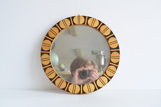 Miroir mural slovaque du milieu du siècle, datant de 1970, au design rétro unique. Le cadre est en placage collé avec un motif élégant. Le placage et le miroir sont patinés et présentent des signes d'utilisation. Parfait pour compléter avec style un intérieur rétro ou vintage.