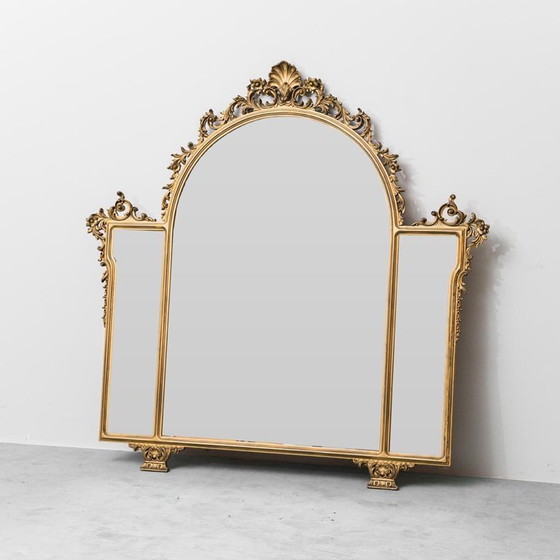 Remontez le temps avec ce superbe miroir mural vintage des années 1950, véritable témoignage de l'élégance d'une époque révolue. Ses dimensions imposantes et ses délicates dorures en font une pièce maîtresse qui sublimera tout intérieur raffiné. Son cadre en bois ouvragé, orné de motifs classiques, reflète le savoir-faire et le luxe du design du milieu du XXe siècle.