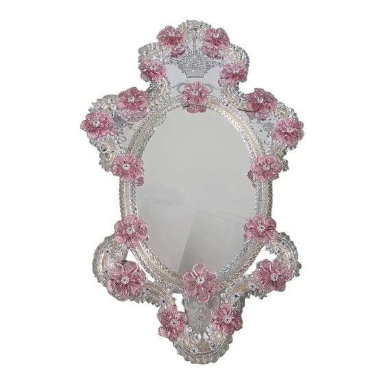 Miroir ovale vénitien classique italien à motif floral rose en verre de Murano sculpté à la main, style Murano