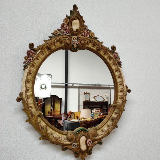 Apportez instantanément du cachet à votre intérieur avec ce magnifique miroir baroque ancien. Son cadre ovale témoigne du savoir-faire du début du XXe siècle. De superbes sculptures sur bois et des ornements détaillés ornent le liseré doré. Les motifs floraux peints à la main, dans des tons rose tendre et crème, confèrent au miroir une allure unique et romantique. De subtiles craquelures et un fin craquelé dans les ornements soulignent son authenticité vintage. Ces marques racontent l'histoire d'un riche passé. Ce miroir chiné est la pièce maîtresse d'un couloir lumineux ou au-dessus d'une commode en bois massif. Vous cherchez un élément décoratif qui attire le regard dans votre chambre ? Ce miroir s'harmonise aussi bien avec les intérieurs modernes que classiques. Apportez une touche d'histoire intemporelle à votre intérieur avec cette trouvaille pleine de charme ! Le miroir est en bon état vintage et peut présenter quelques traces d'usage. De par son âge, il peut comporter quelques imperfections qui contribuent à son caractère unique.